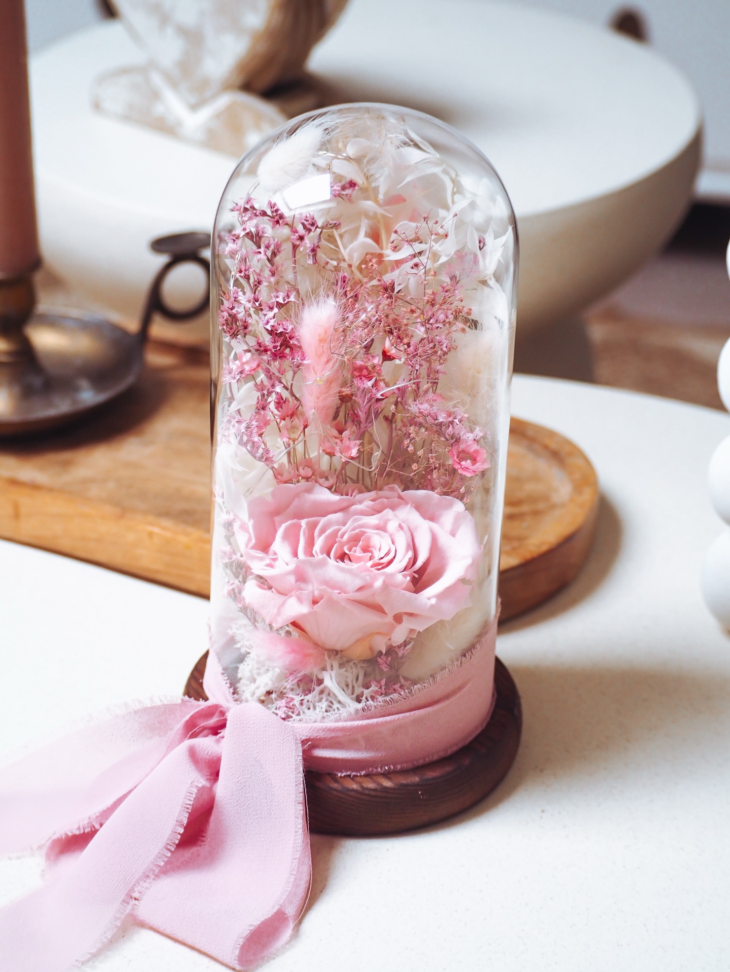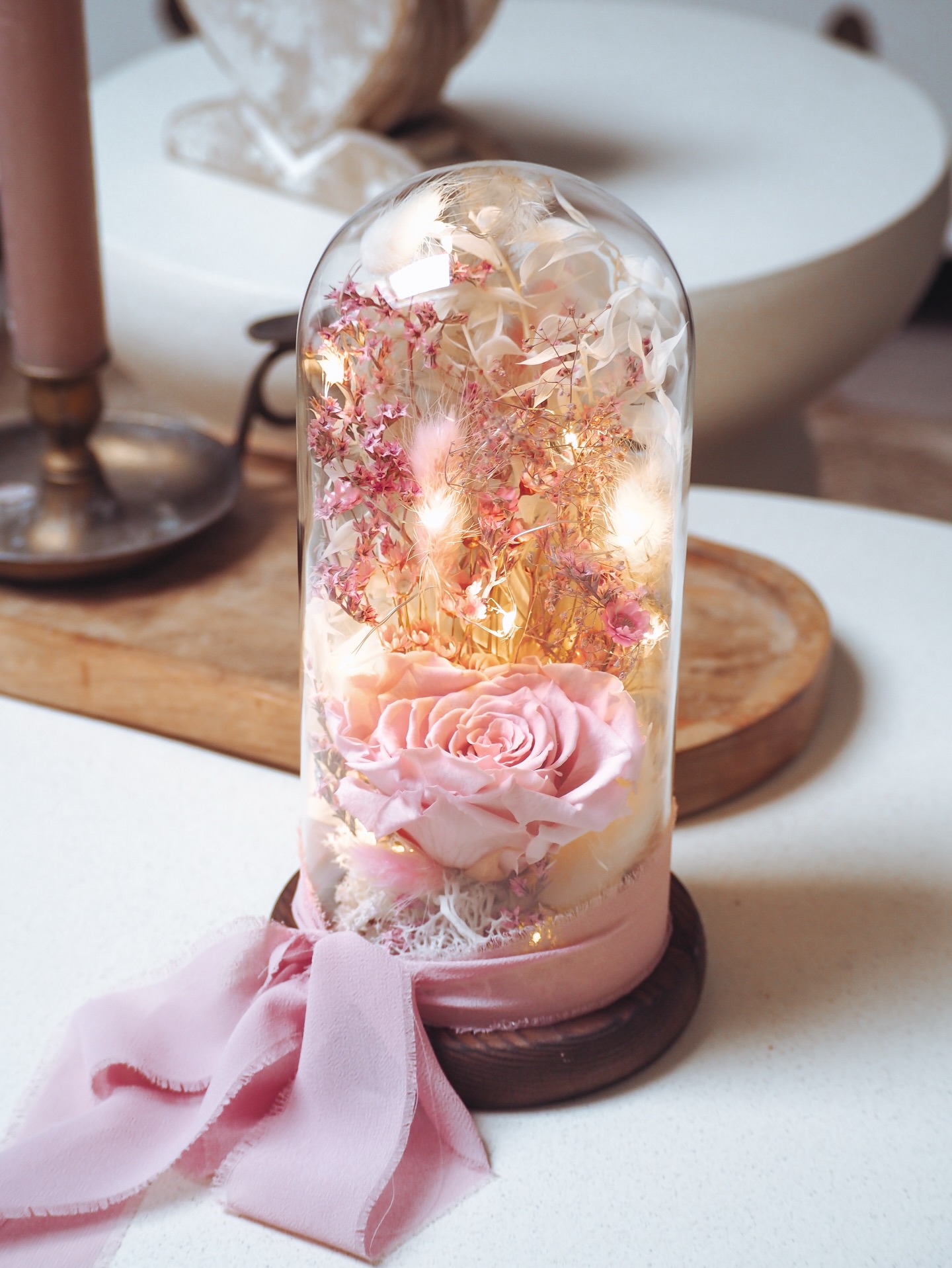 kopuły z drewnianą podstawą i świecącymi ledami, całość jest zamontowana w podstawie w bardzo estetyczny sposób. Teraz Twoja ulubiona dekoracja może posłużyć jako lampka nocna, ciepły blask pięknie rozprasza się na suszonych kwiatach, tworząc przytulną atmosferę. Ten uroczy klosz to coś więcej niż dekoracja – to zamknięty pod szkłem kawałek magii, który nigdy nie zwiędnie!