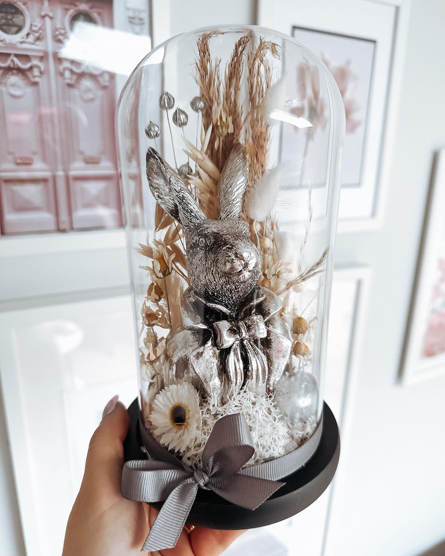 Kopuła na podstawie drewnianej czarnej, szklana o wysokości 22 cm ze srebrnym zajączkiem.