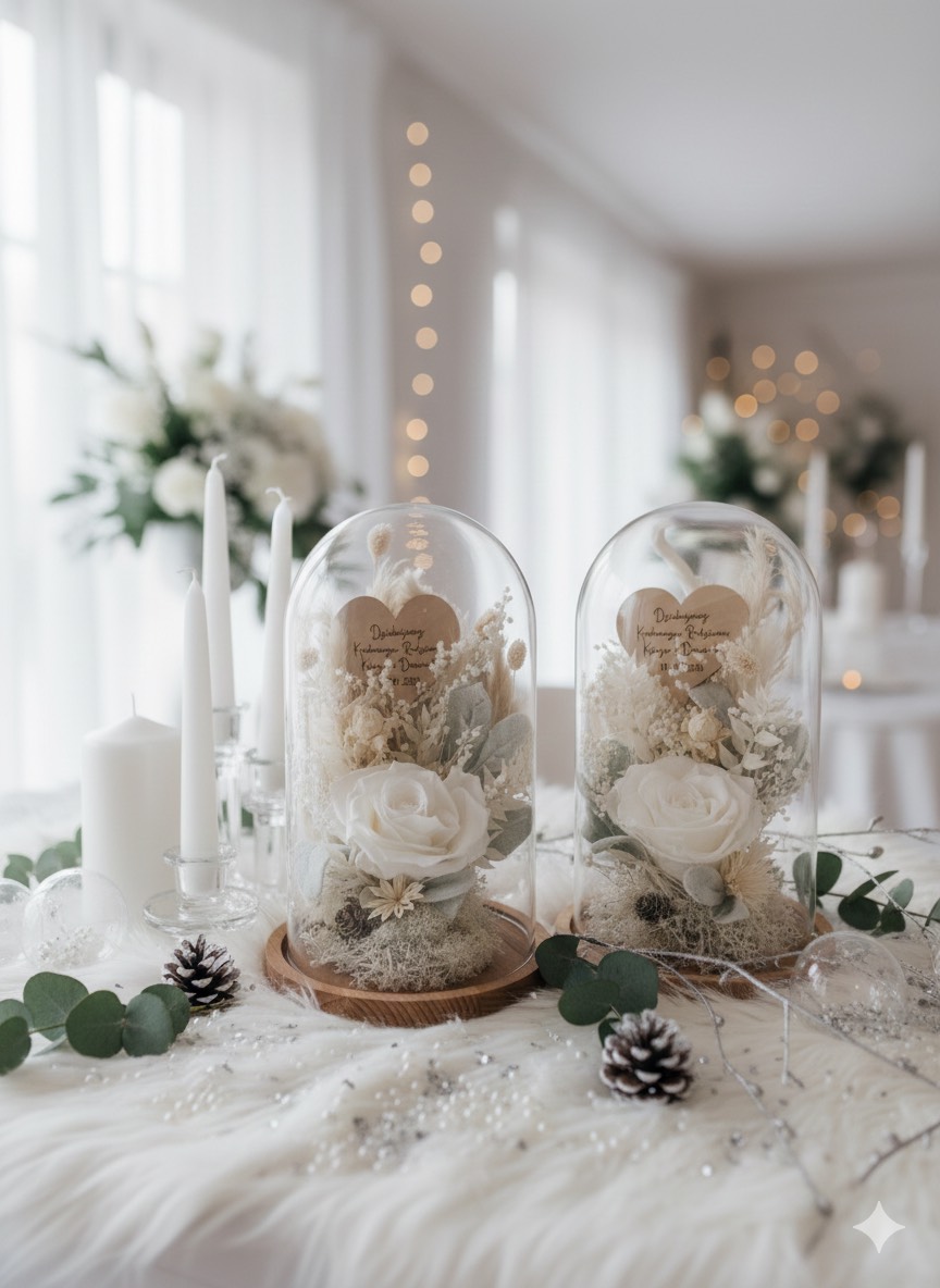 Niesamowita kopuła na podstawie drewnianej, szklana o wysokości 27 cm z wieczną różą.