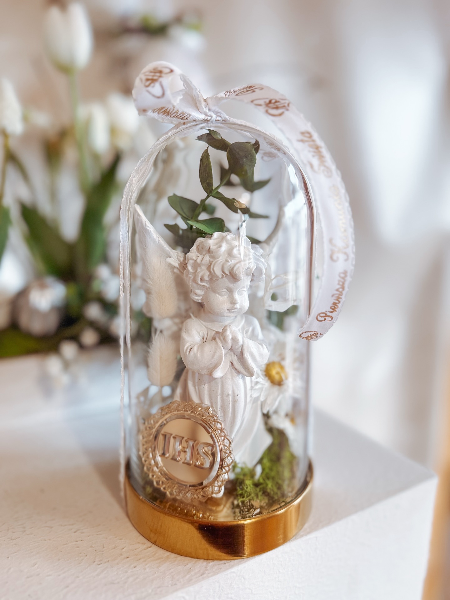Ręcznie dopracowana kompozycja: Biały aniołek w modlitewnej pozie otoczony naturalnym mchem i subtelnymi dodatkami.