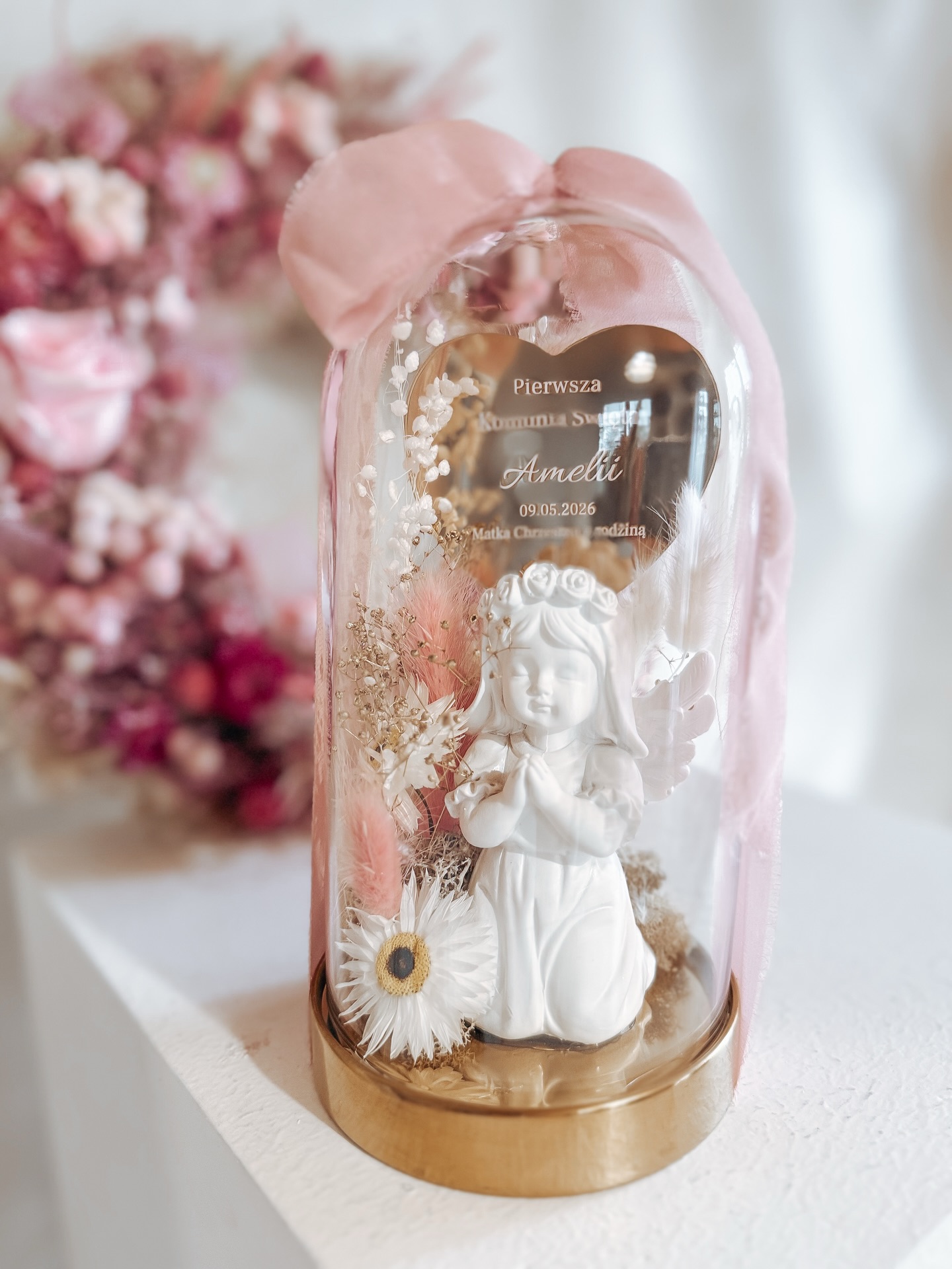 W szklanej kopule zamknięta została delikatna figurka modlącego się aniołka w otoczeniu naturalnych, suszonych kwiatów w odcieniach pudrowego różu i bieli.