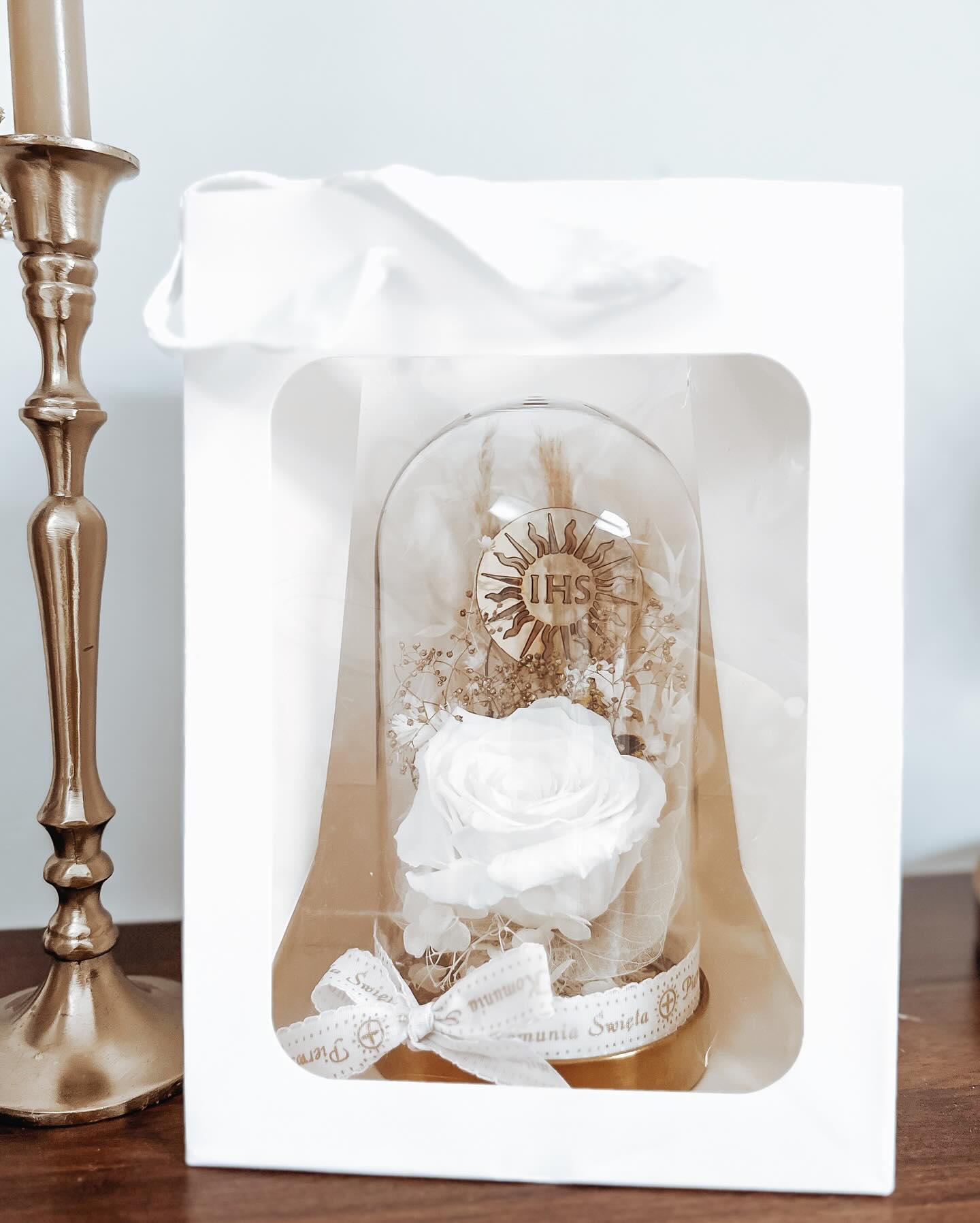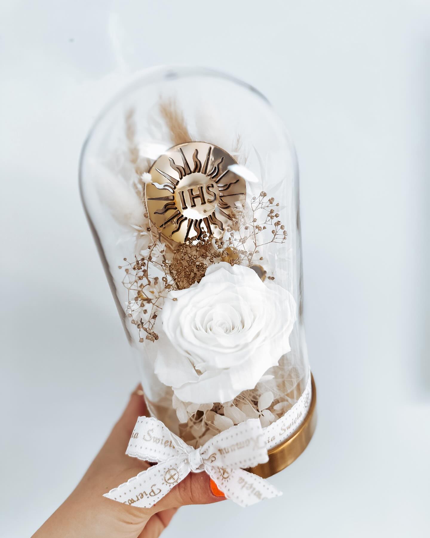 Kopuła na podstawie złotej, szklana o wysokości 20 cm z bukietem kwiatów.