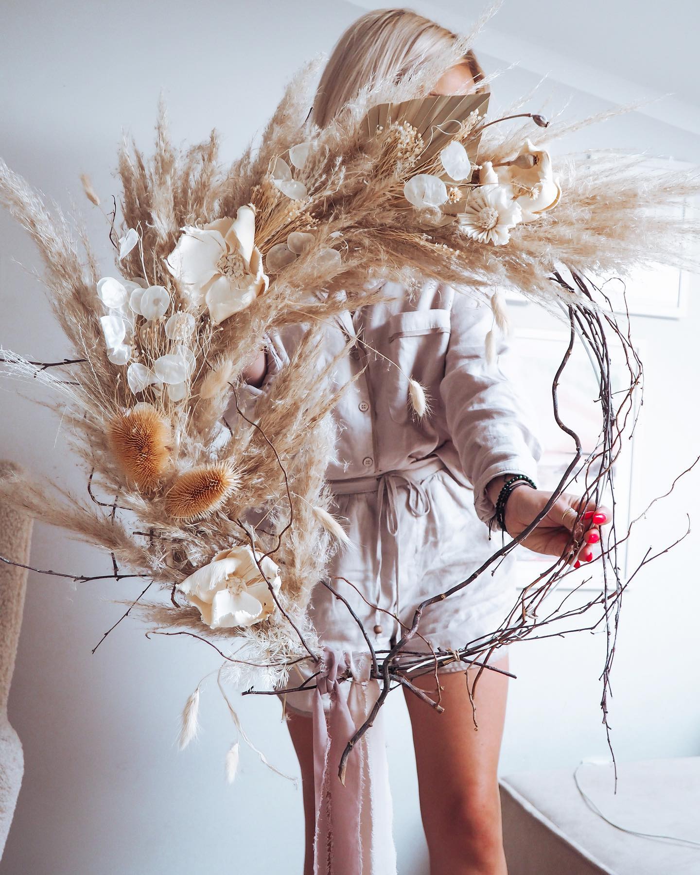 Suszone trawy pampasowe, preparowane rośliny oraz egzotyczne kwiaty w połączeniu z gałązkami brzozy tworzy niepowtarzalny wianek.