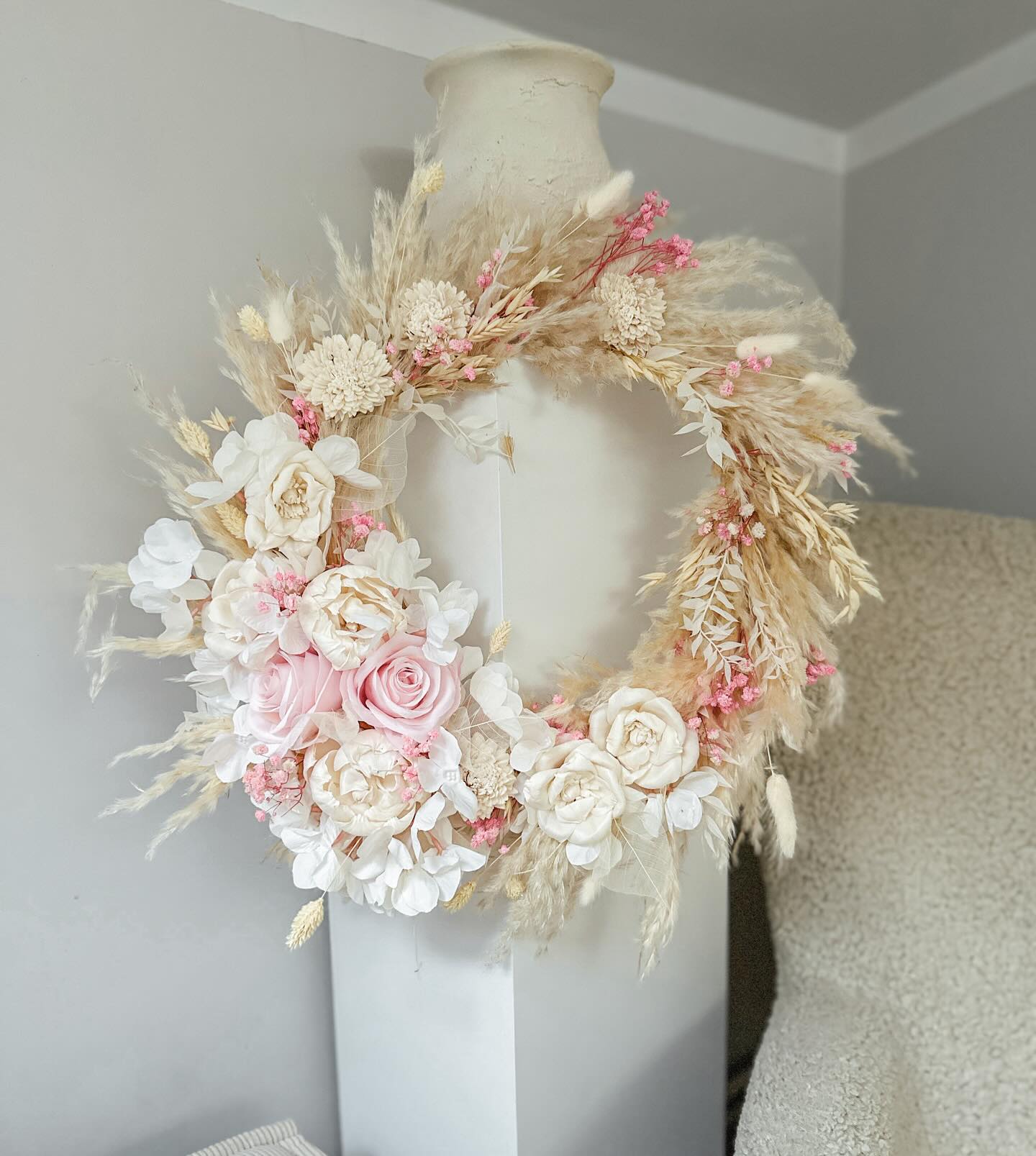 Dekoracyjny wianek z trawy pampasowej w roli głównej.