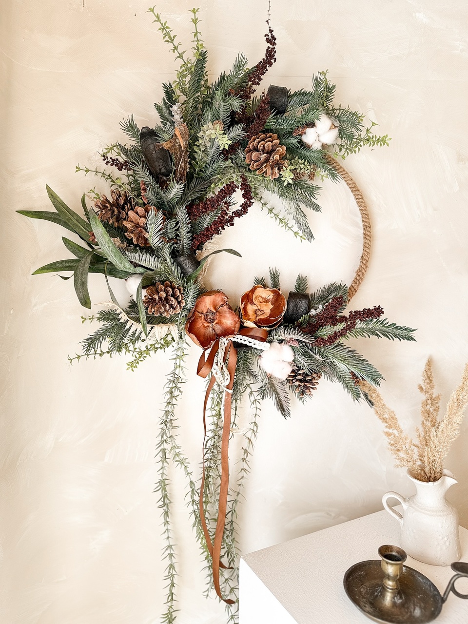 Dekoracja ze sztucznych gałązek świerkowych, dodatkiem naturalnych szyszek oraz suszu w kolorach czerni i brązu.