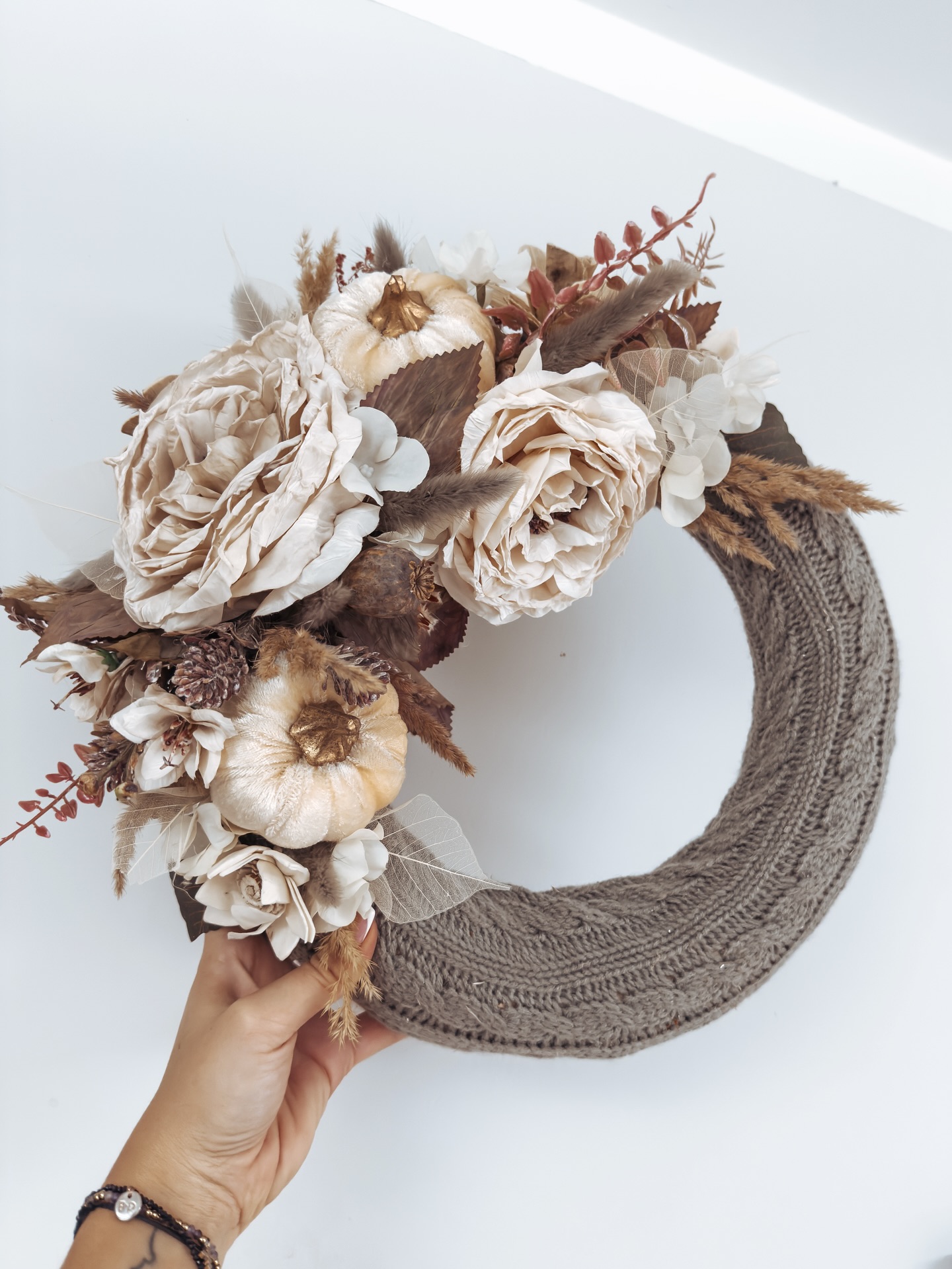 Wianek z dekoracyjny w kolorach kremu na szarym sweterku.
