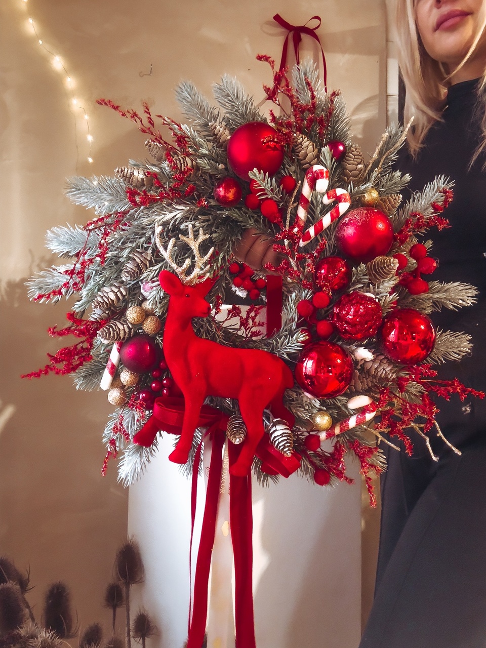 Wianek w kolorach świątecznej czerwieni, welurowy renifer w roli głównej. Stwórz zestaw z dekoracją na stół oraz bombkami!