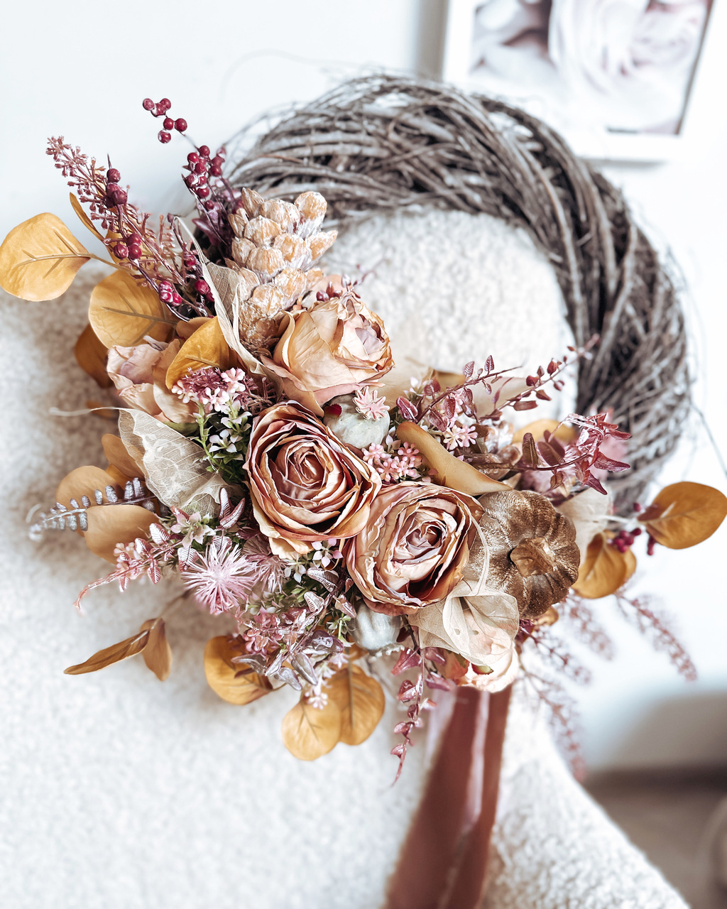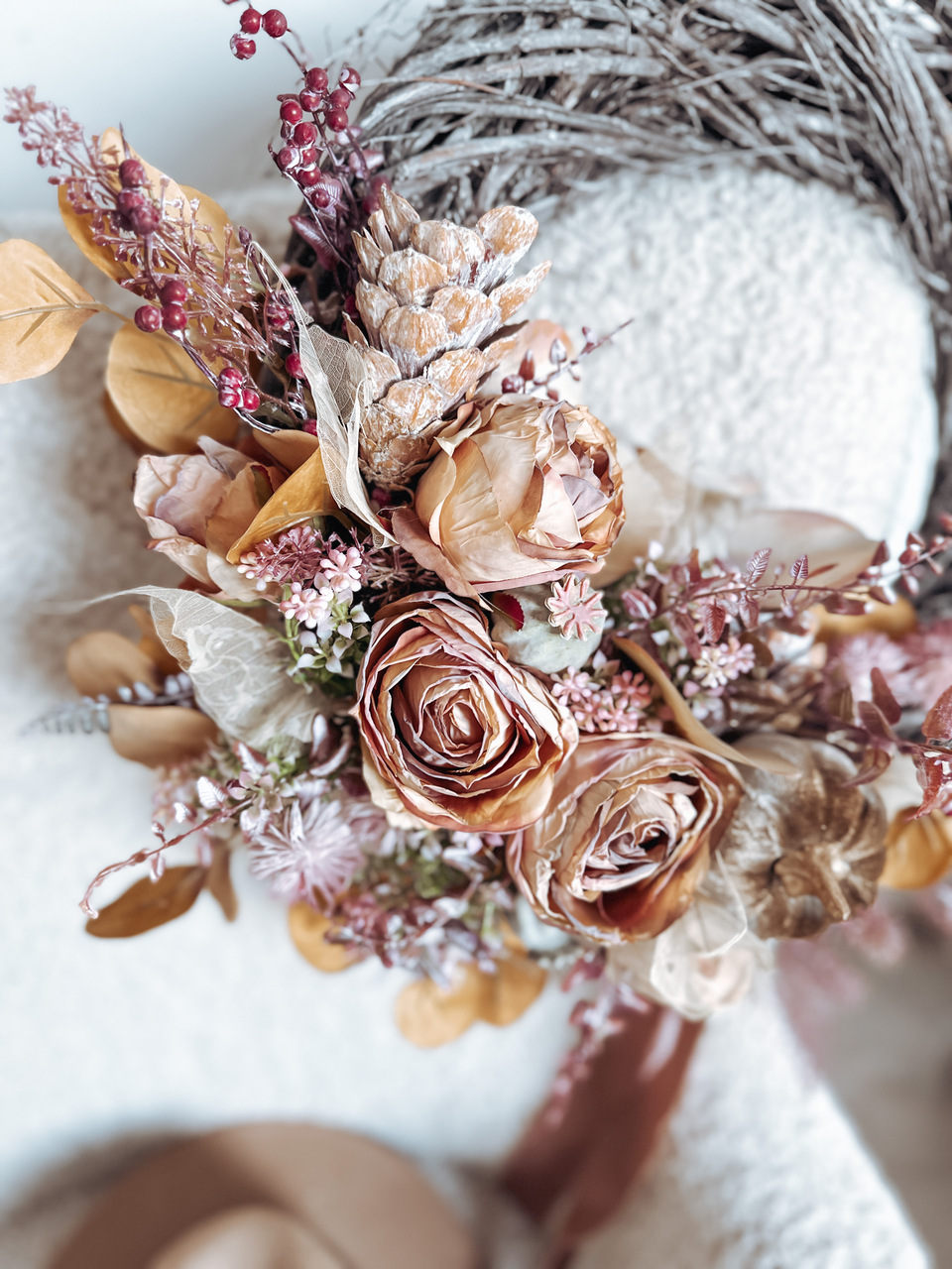Dekoracja z kwiatów bardzo jesiennych, postarzałych vintage róż oraz dodatków.