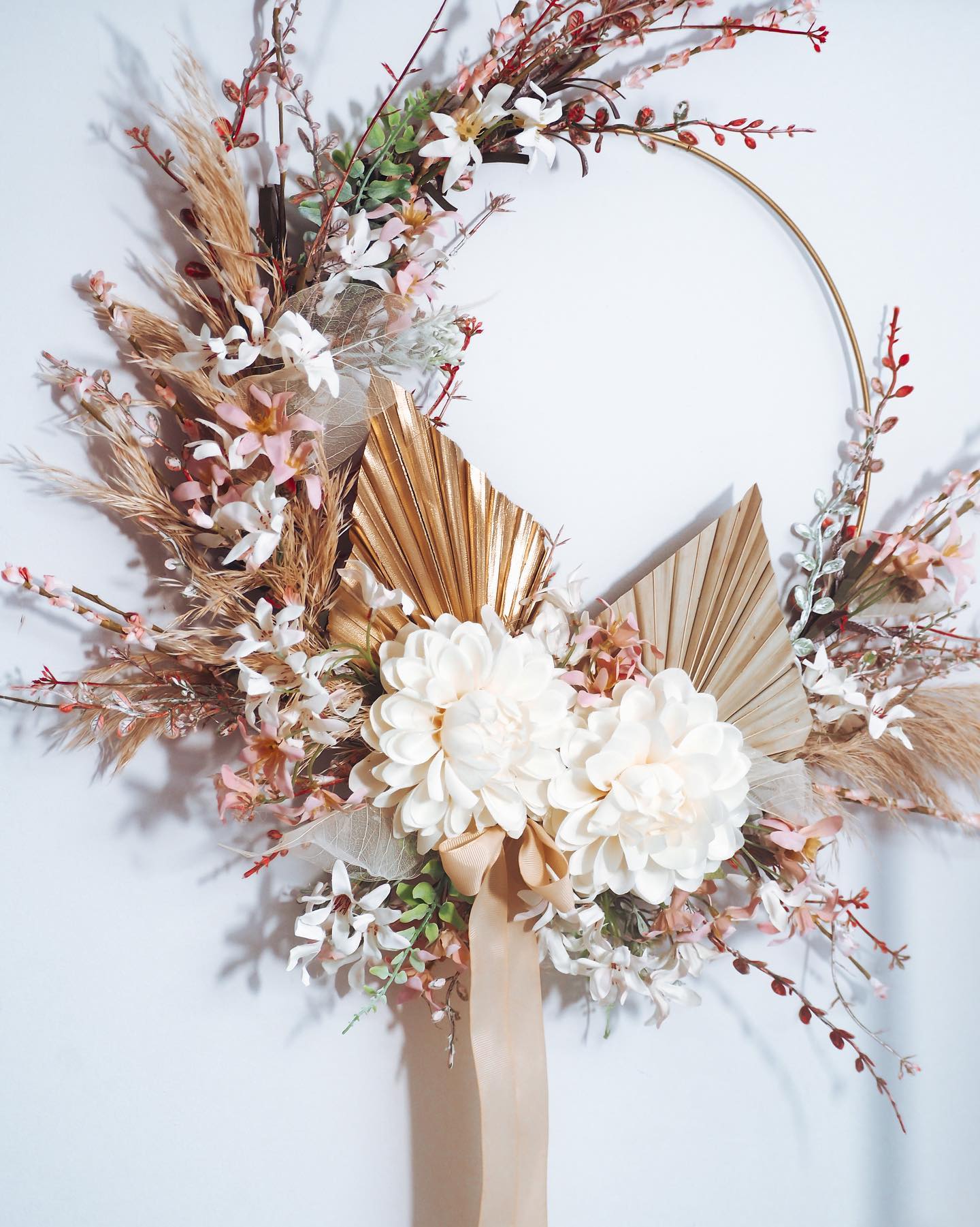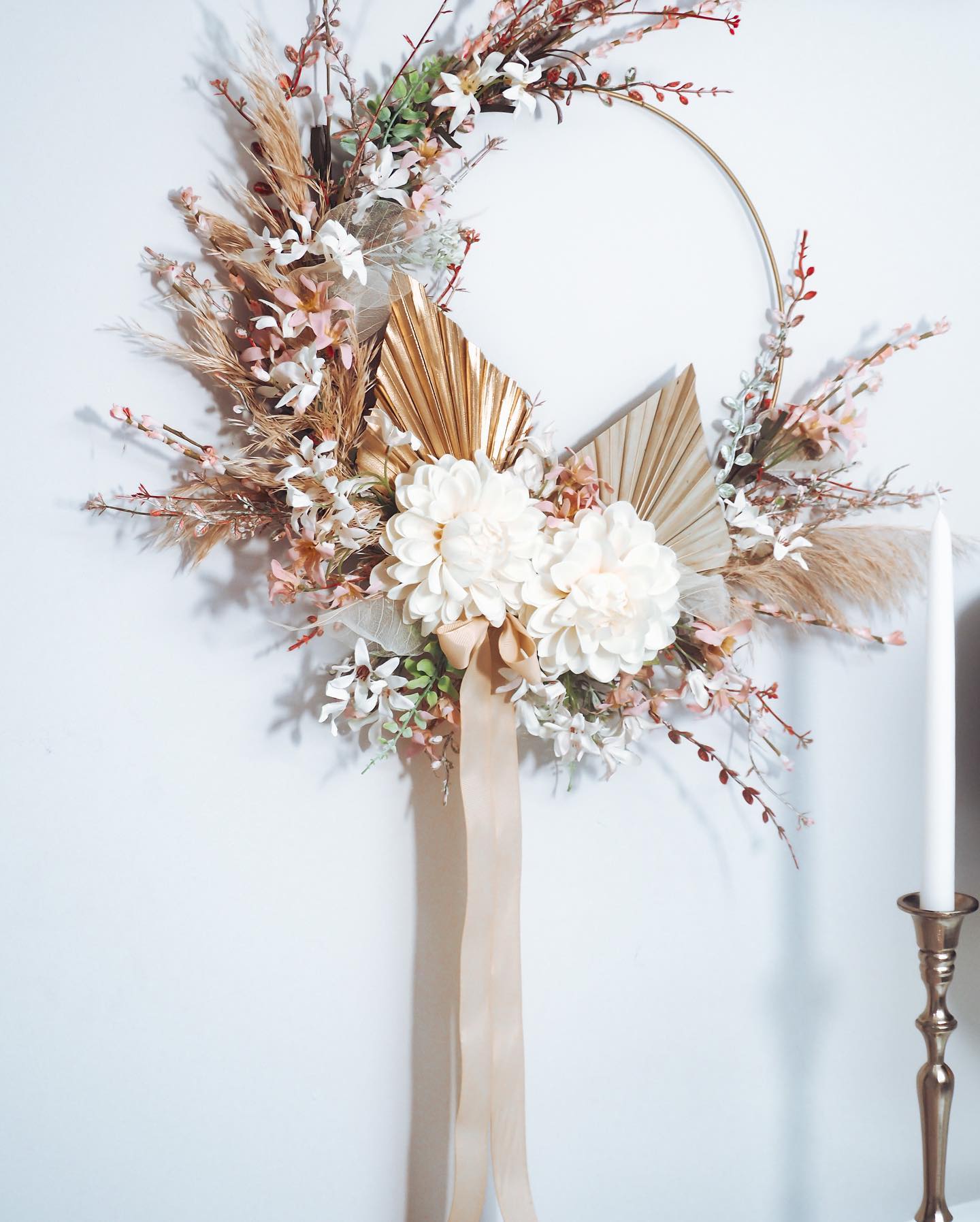Jedwabne kwiaty, dodatki złotych palm i roślin polnych dodają uroku i kobiecości całej dekoracji.