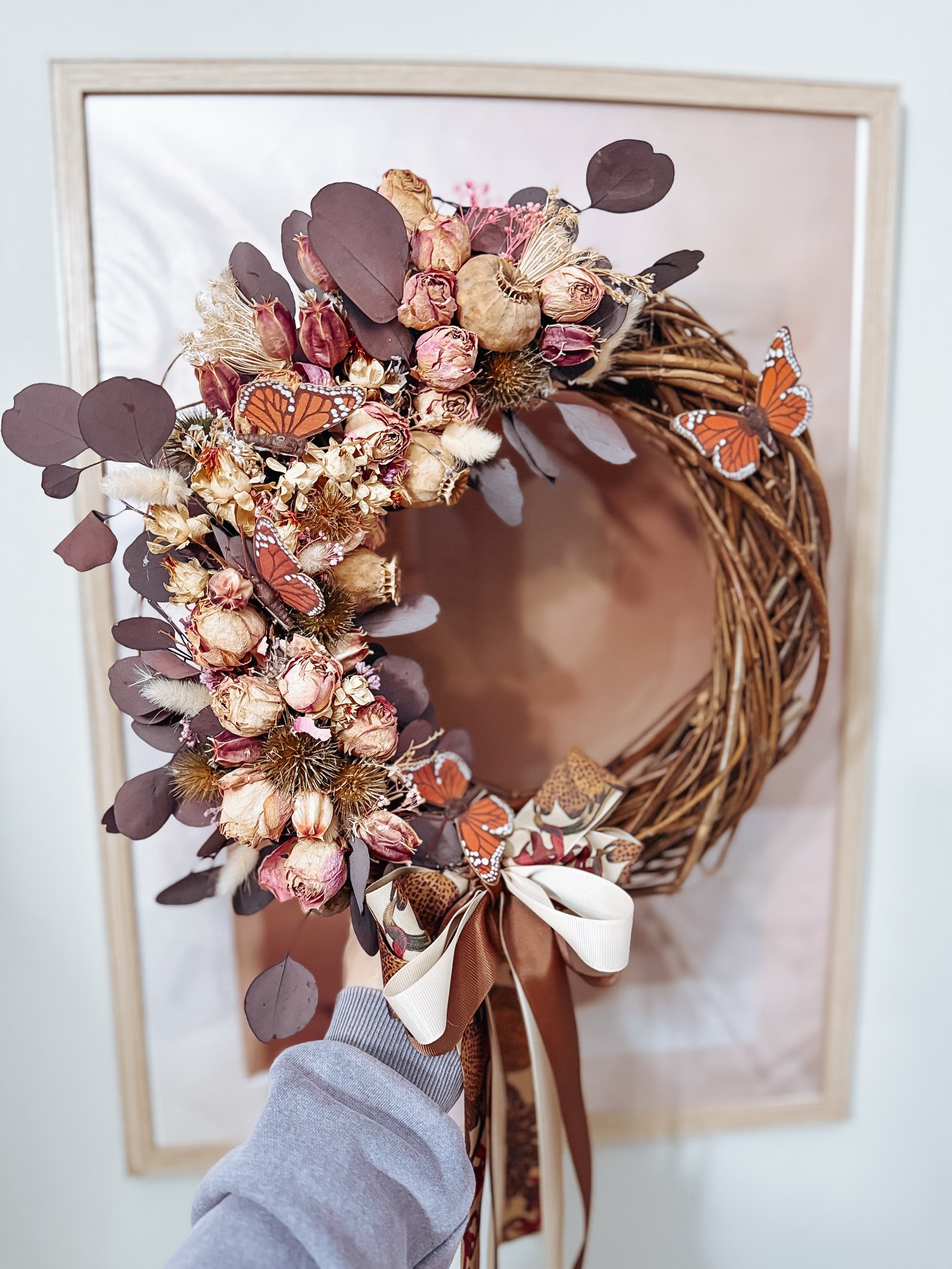 Wianek dekoracyjny na gałązkowym kole z suszonych roślin