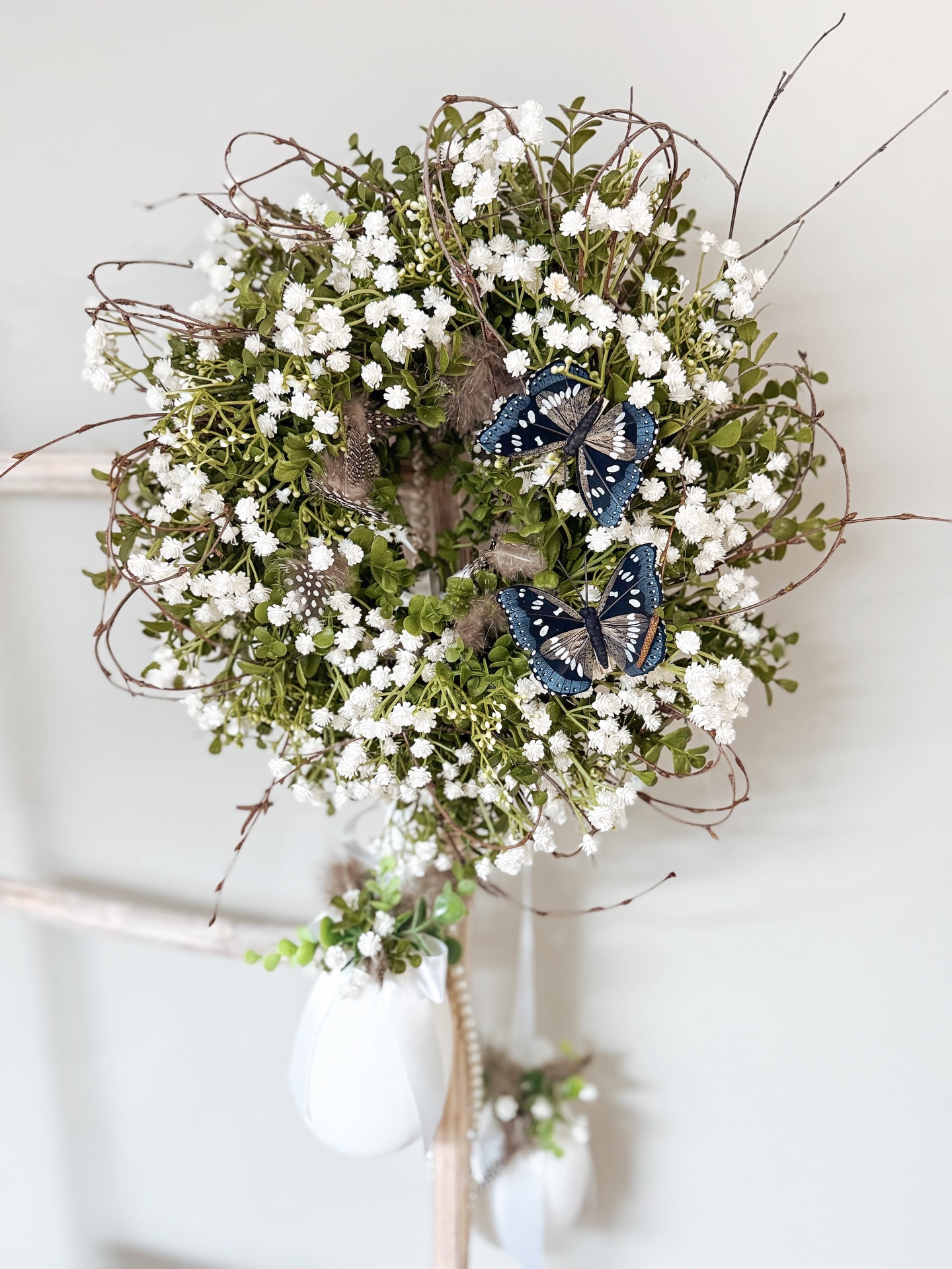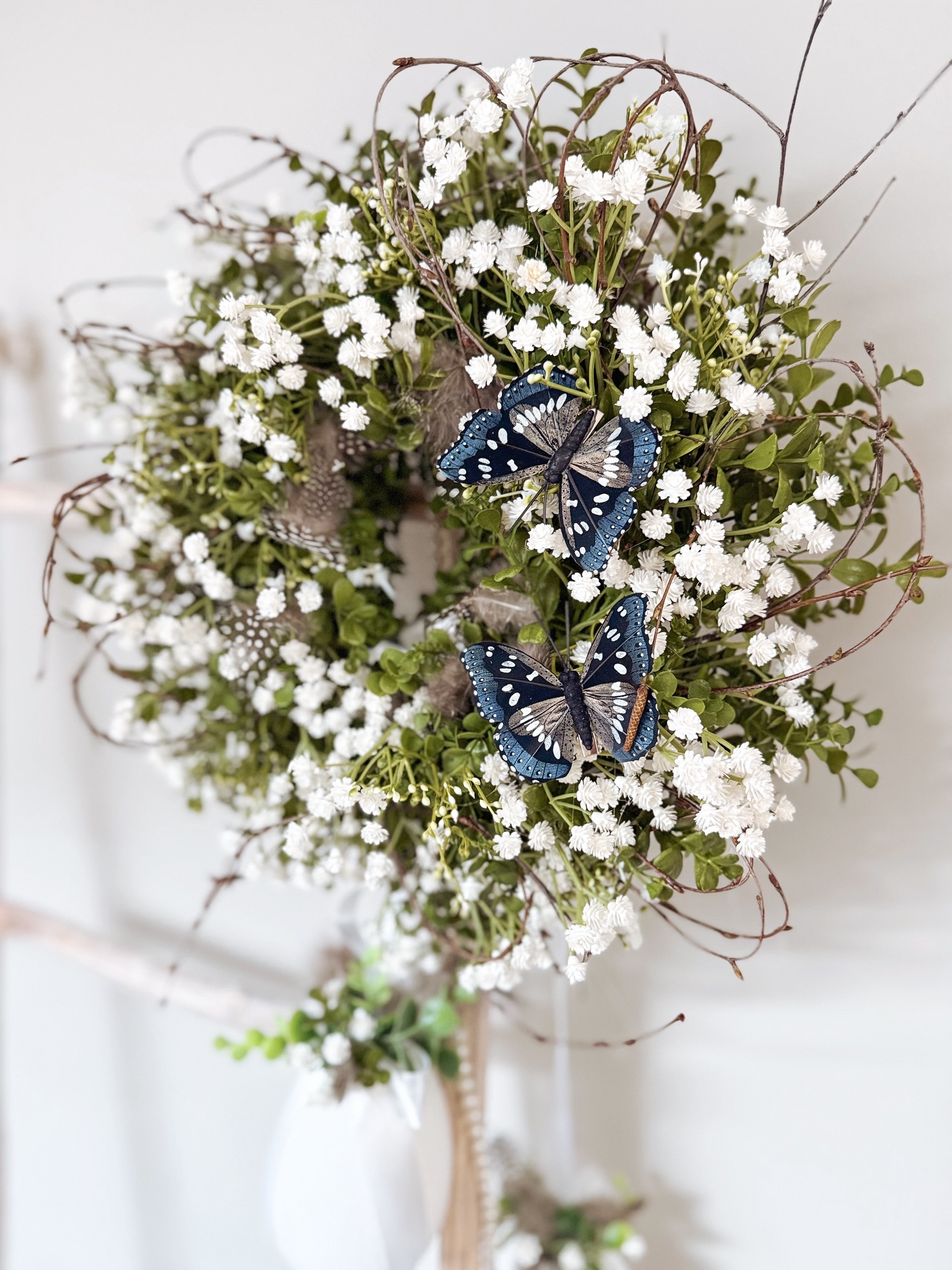 biel gipsówki w towarzystwie leśnych akcentów i błękitnych motyli. Ten