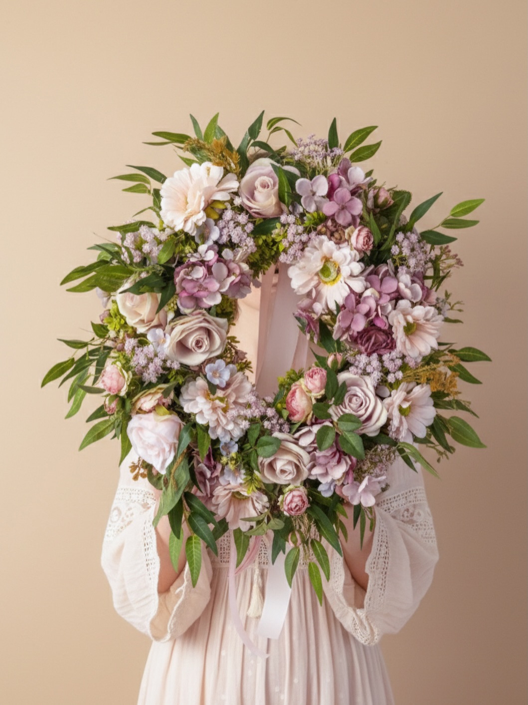 Ten wieniec to nie tylko dekoracja – to obietnica wiosennego nastroju, który zatrzyma się w Twoim domu na dłużej. Subtelny, romantyczny i wykonany z niezwykłą dbałością o detale, przyciąga wzrok harmonijną paletą barw. Kompozycja łączy w sobie klasyczne róże, delikatne gerbery oraz puszyste kwiatostany przypominające bez i hortensję. Całość jest przełamana świeżą zielenią liści, co nadaje wiankowi naturalny, lekki wygląd, jakby przed chwilą został przyniesiony z kwitnącego ogrodu.