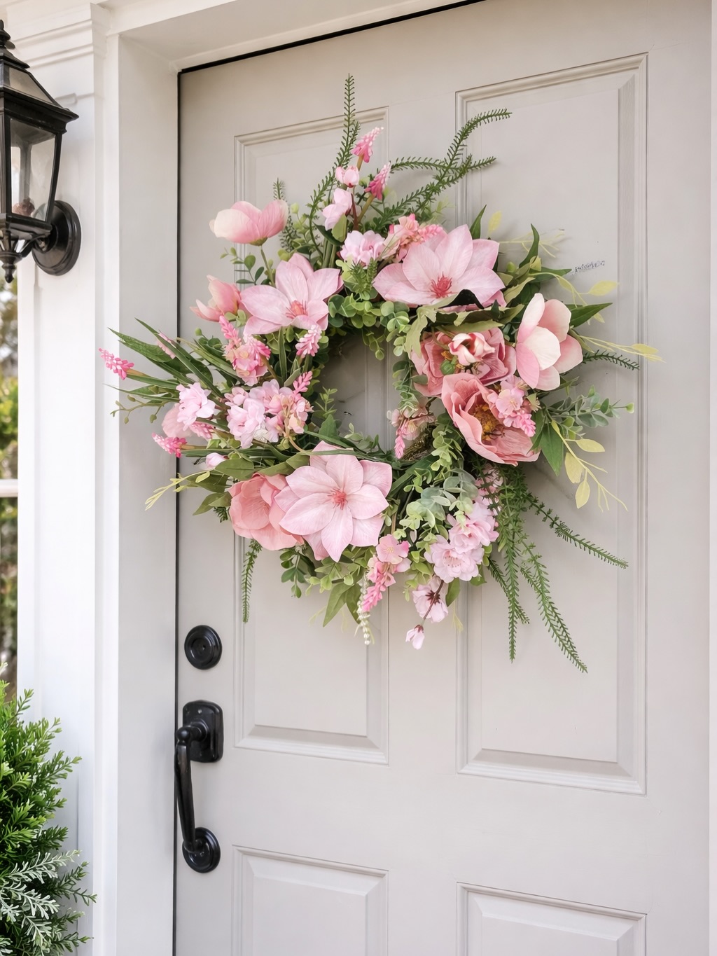 Delikatna kompozycja pełna romantycznych, różowych kwiatów i świeżej zieleni, która pięknie wita gości już od progu domu.