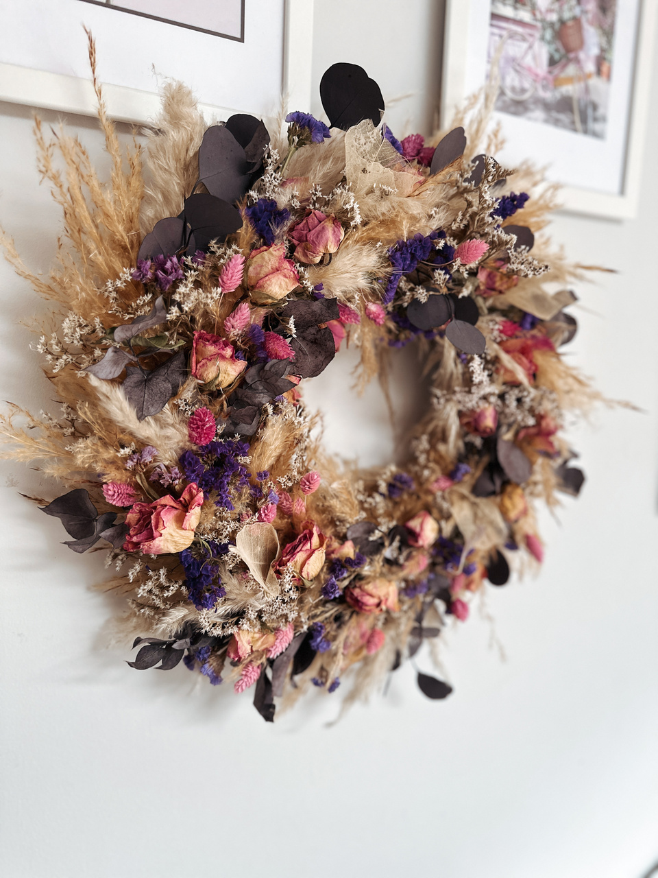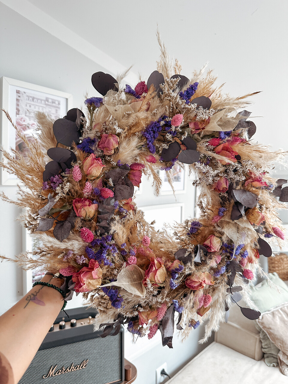 Dekoracja z suszonych kwiatów oraz stabilizowanych dodatków.