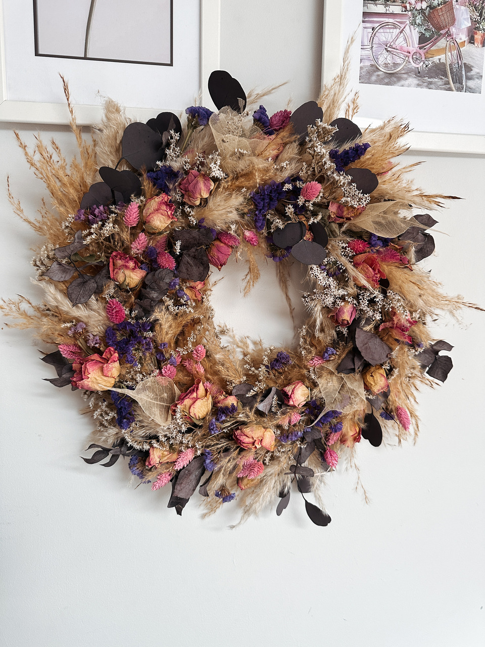 Róże, trawa pampasowa, dmuszek, stabilizowany eukaliptus, zatrwian.