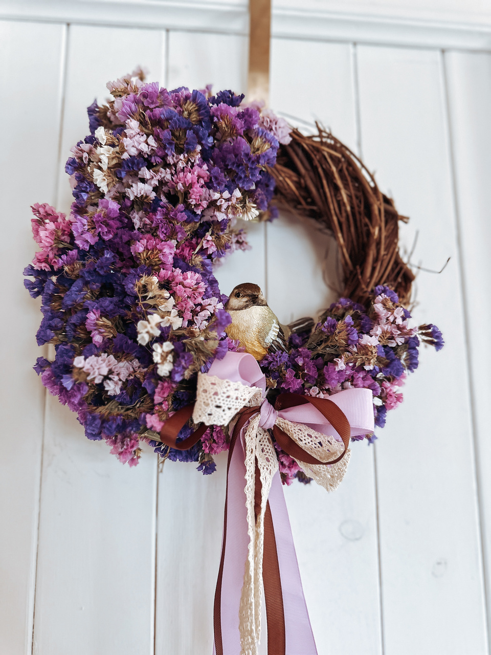 Wianek gałązkowy z dekoracją suszonego zatrwianu.