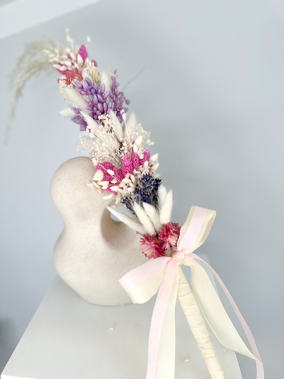 Dekoracja z suszonych kwiatów oraz stabilizowanych dodatków.